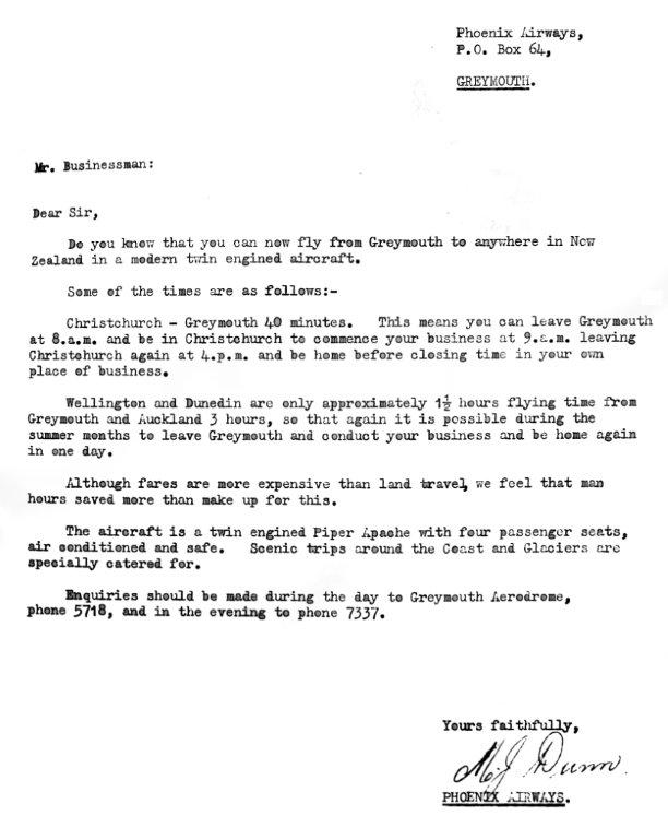 On the 4th of September 1963 the Air Services Licensing Authority granted an application by Phoenix Airways Ltd to extend its charter operations by allowing a thrice weekly Greymouth-Christchurch trans-alpine service. Company Manager and chief pilot, Merv Dunn, announced that day in the Greymouth Evening Star that he intended the new service to start on the 9th of September with the Apache leaving Greymouth at 8.15 a.m. to arrive in Christchurch by 9.00 a.m. and returning from Christchurch at 4.15 p.m. to reach Greymouth at 5.00 p.m.
