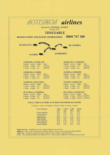 Following the collapse of United Aviation that had operated the Napier Gisborne service a number of people requested Aotearoa Airlines to fill the gap. On the 28th of July 1997 Aotearoa Airlines responded to the need and offered two return flights each weekday to Napier. Timetables were altered to fit in the new service allowing customers to connect with the airline's existing Gisborne to Hamilton flights.