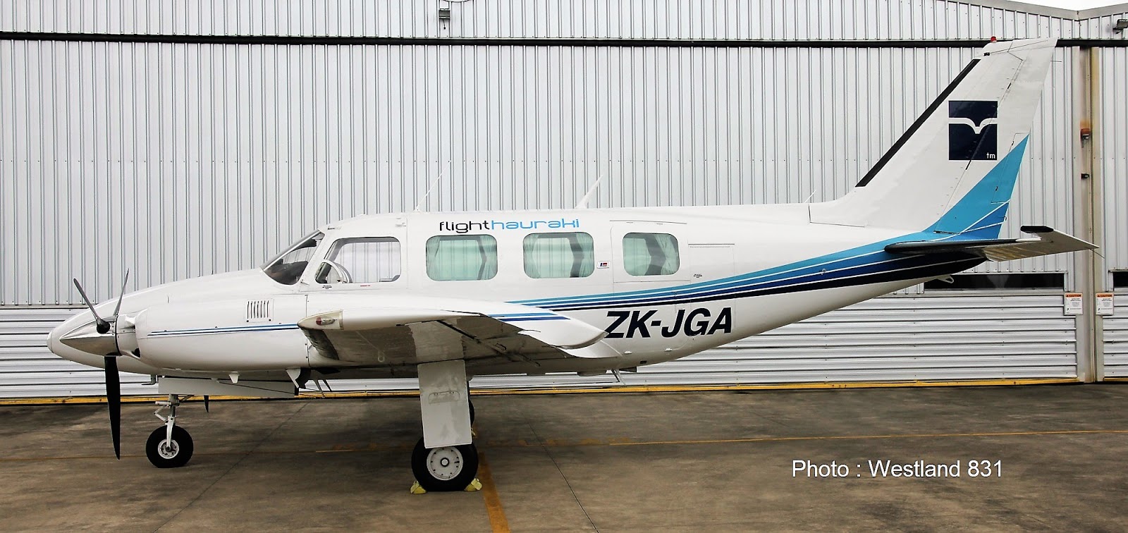 | Piper PA31 Navajo ZK-JGA in FlightHauraki markings at Ardmore on 24 March 2017 |