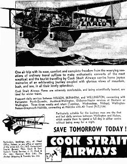 As early as October 1934 the still unregistered Cook Strait Airways was planning an air service between Wellington and Hokitika. Wellington’s Evening Post of the 30th of October reported that, “An air service joining Wellington, Blenheim, Nelson, and Hokitika is planned by Cook Strait Airways, a new company of which registration will be gazetted within a few days. The three main shareholders are the Union Steam Ship Company of New Zealand, Ltd., Newman Brothers, Ltd., and the Anchor Shipping and Foundry Company, Ltd. The present intention is that the company aeroplanes shall leave Wellington in the morning and cross to Blenheim, Nelson, and Hokitika, which will be reached about noon. There the service will connect with the South Westland service, to be operated by the company in which Mr. J. C. Mercer is interested. In the afternoon the machine will return by the same route, arriving at about 5 or 0 o'clock in the evening. The schedule is, however, only tentative, as the company has at present no idea what type of aeroplanes it will use, except that, because of the water crossing, they will have more than one engine.”